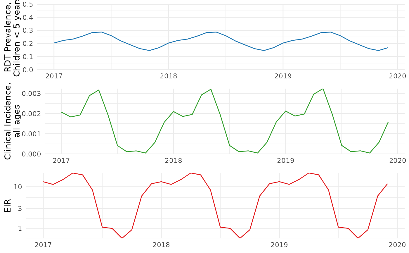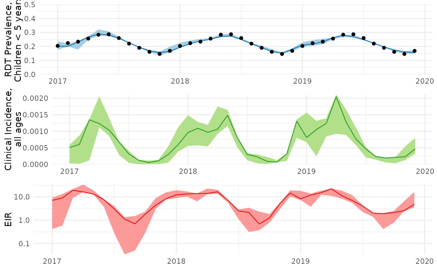 Since the relationship between mosquito emergence rates and infection prevalence is encoded within the mechanistic model, anatembea allows us to infer trends in key indicators like the entomological inoculation rate (EIR) and clinical incidence, which are otherwise challenging to measure directly.