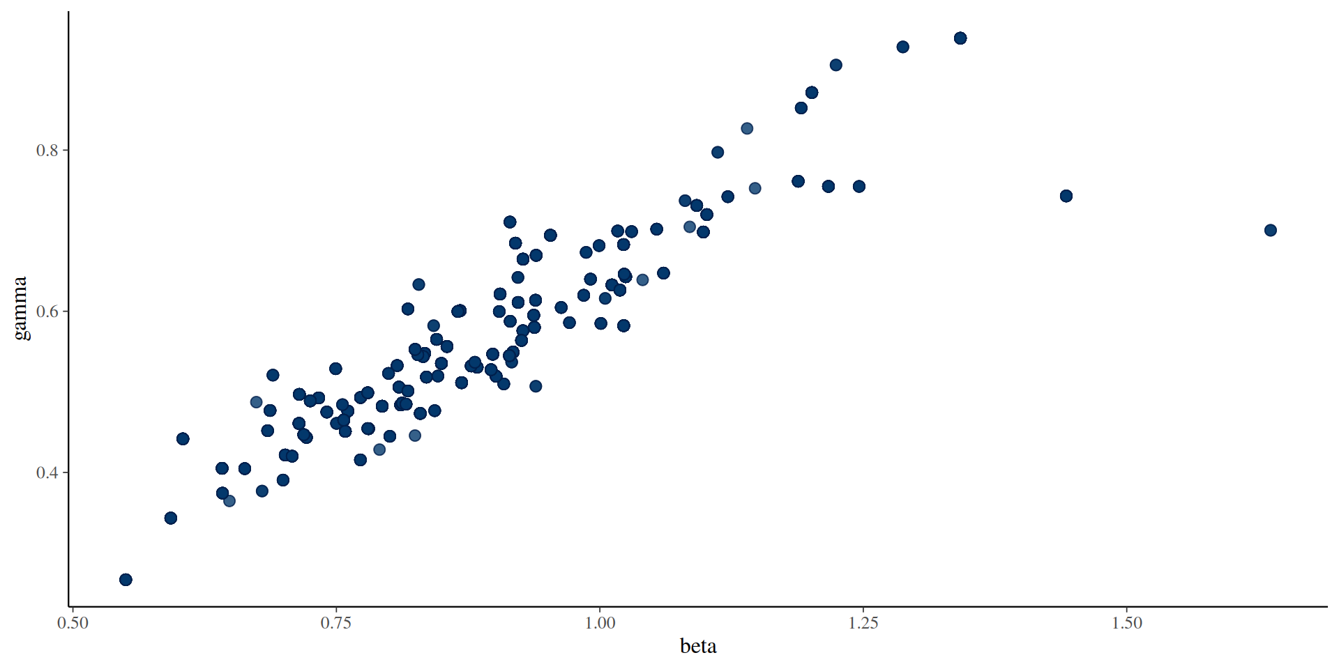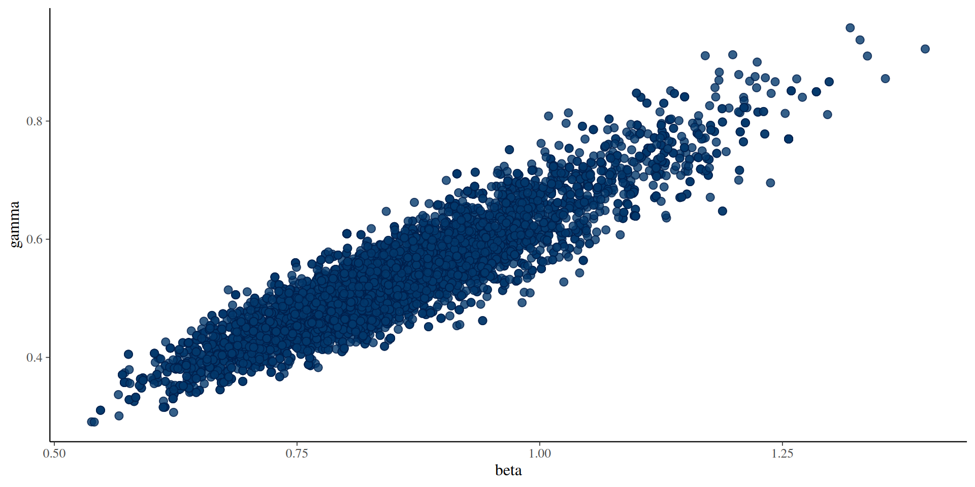 plot(pars_stochastic[1, ], pars_stochastic[2, ], ylab = "gamma", xlab = "beta",