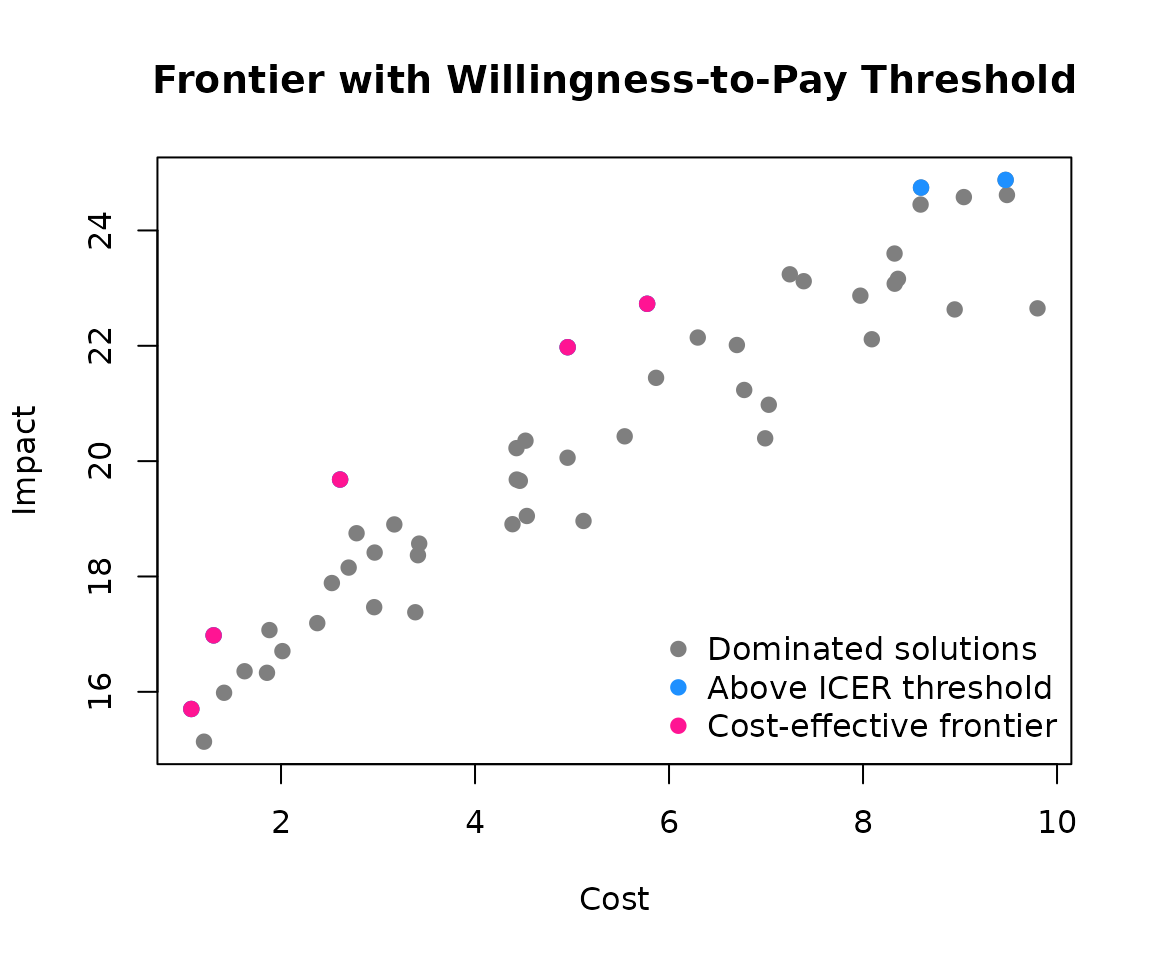 legend = c("Dominated solutions", "Above ICER threshold", "Cost-effective frontier"),