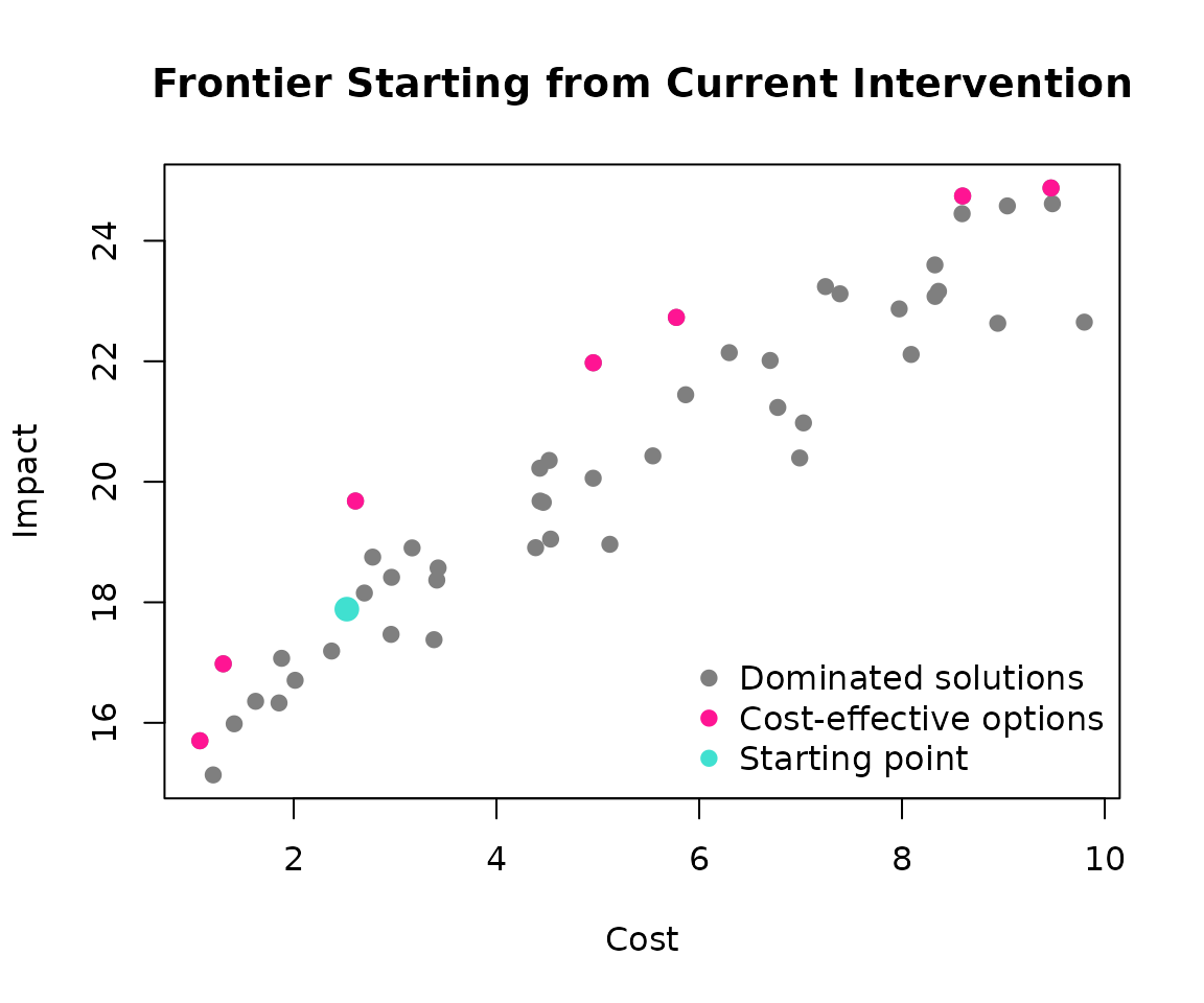 The simplest use of frontier() identifies all non-dominated solutions. These are interventions where no other option provides better impact for the same or lower cost:
