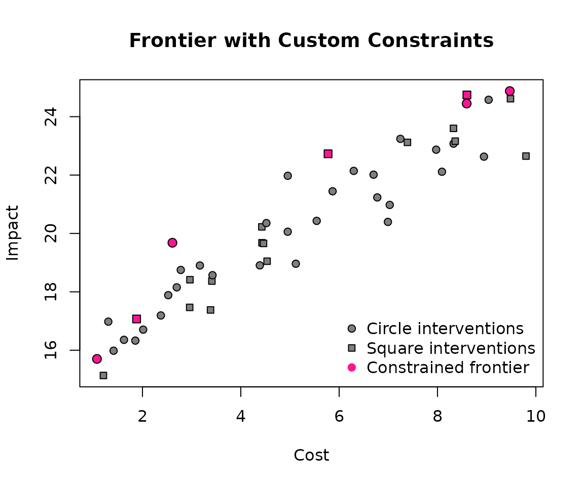 legend = c("Circle interventions", "Square interventions", "Constrained frontier"),
