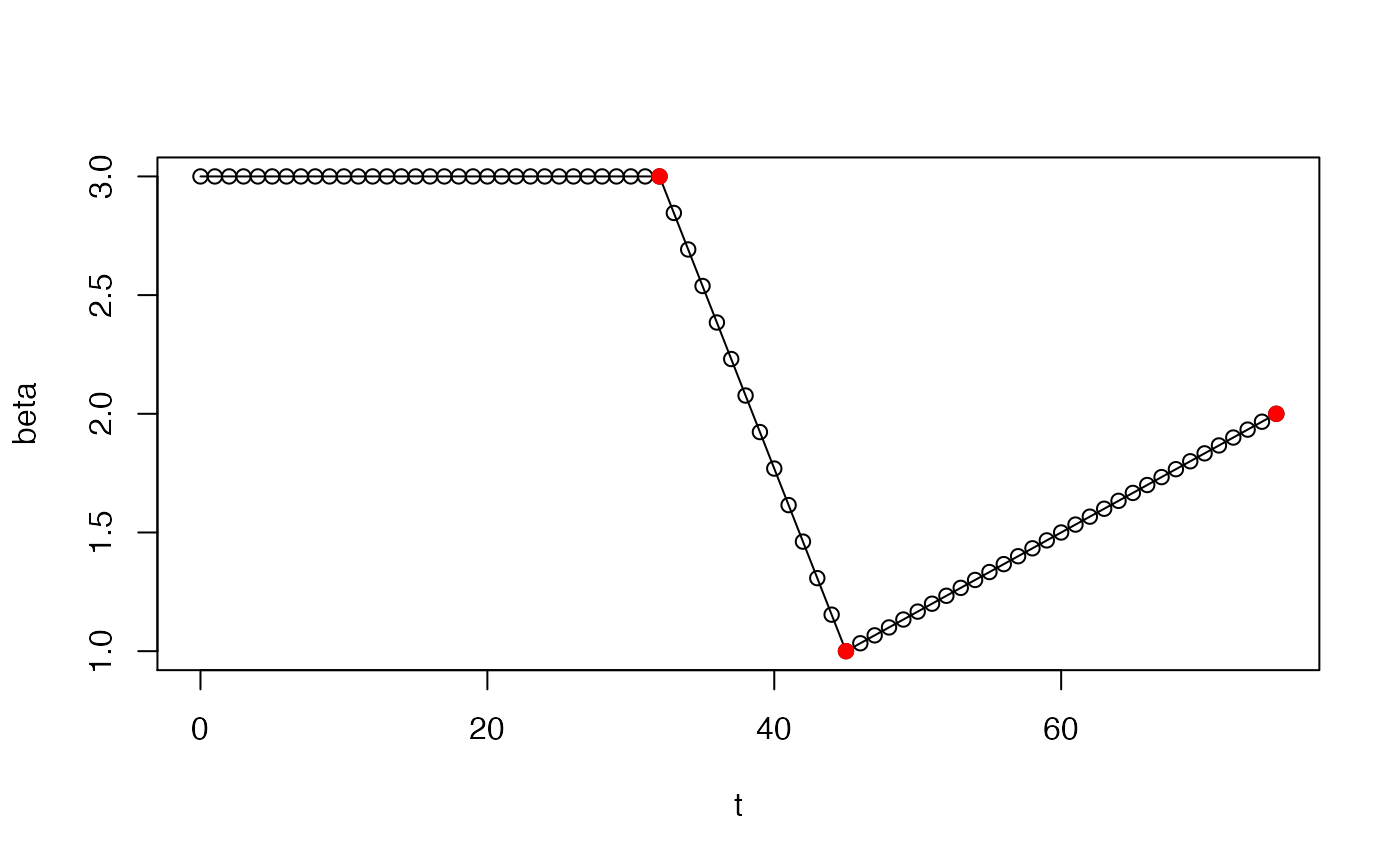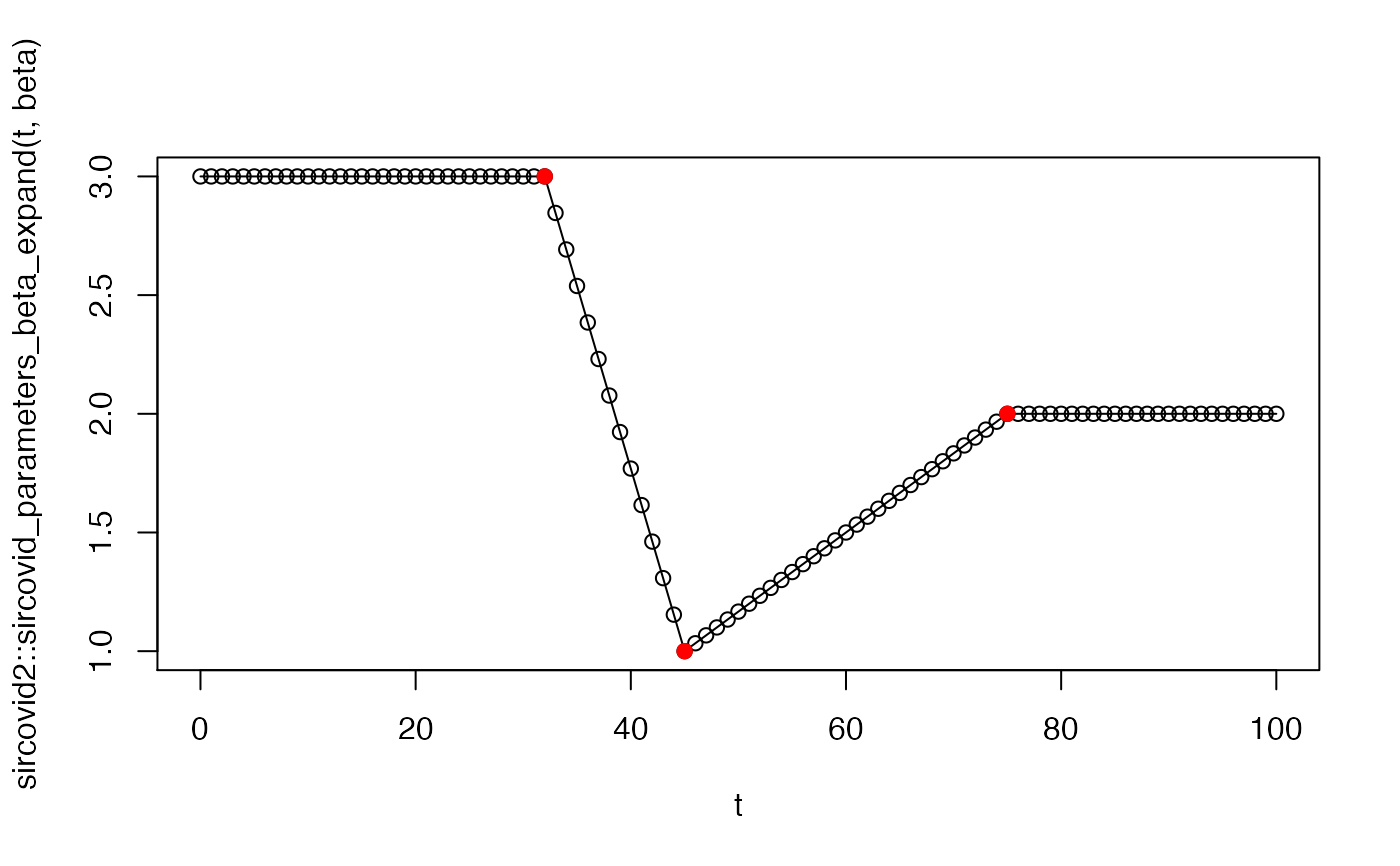 # If "date" is NULL, then beta is constant and this function is # trivial: sircovid2::sircovid_parameters_beta(NULL, 0.1, 0.25)#> [1] 0.1date <- sircovid2::sircovid_date( c("2020-02-01", "2020-02-14", "2020-03-15")) value <- c(3, 1, 2) beta <- sircovid2::sircovid_parameters_beta(date, value, 1) # The implied time series looks like this: t <- seq(0, date[[3]]) plot(t, beta, type = "o")# After 2020-03-15, the beta value will be fixed at 2, the value # that it reached at that date. # You can see this using sircovid_parameters_beta_expand # If a vector of dates is provided then, it's more complex. We'll # use dt of 1 here as it's easier to visualise t <- seq(0, 100, by = 1) sircovid2::sircovid_parameters_beta_expand(t, beta)#> [1] 3.000000 3.000000 3.000000 3.000000 3.000000 3.000000 3.000000 3.000000 #> [9] 3.000000 3.000000 3.000000 3.000000 3.000000 3.000000 3.000000 3.000000 #> [17] 3.000000 3.000000 3.000000 3.000000 3.000000 3.000000 3.000000 3.000000 #> [25] 3.000000 3.000000 3.000000 3.000000 3.000000 3.000000 3.000000 3.000000 #> [33] 3.000000 2.846154 2.692308 2.538462 2.384615 2.230769 2.076923 1.923077 #> [41] 1.769231 1.615385 1.461538 1.307692 1.153846 1.000000 1.033333 1.066667 #> [49] 1.100000 1.133333 1.166667 1.200000 1.233333 1.266667 1.300000 1.333333 #> [57] 1.366667 1.400000 1.433333 1.466667 1.500000 1.533333 1.566667 1.600000 #> [65] 1.633333 1.666667 1.700000 1.733333 1.766667 1.800000 1.833333 1.866667 #> [73] 1.900000 1.933333 1.966667 2.000000 2.000000 2.000000 2.000000 2.000000 #> [81] 2.000000 2.000000 2.000000 2.000000 2.000000 2.000000 2.000000 2.000000 #> [89] 2.000000 2.000000 2.000000 2.000000 2.000000 2.000000 2.000000 2.000000 #> [97] 2.000000 2.000000 2.000000 2.000000 2.000000# If dt is less than 1, this is scaled, but the pattern of beta # change is the same beta <- sircovid2::sircovid_parameters_beta(date, value, 0.5) t <- seq(0, date[[3]], by = 0.5) plot(t, beta, type = "o", cex = 0.25)